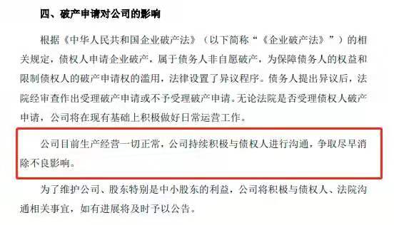 腾邦国际方面称,公司破产清算申请是否被法院受理,公司是否进入破产清算程序尚存在重大不确定性。目前,公司生产经营一切正常,正持续积极与债权人进行沟通,争取尽早消除不良影响。