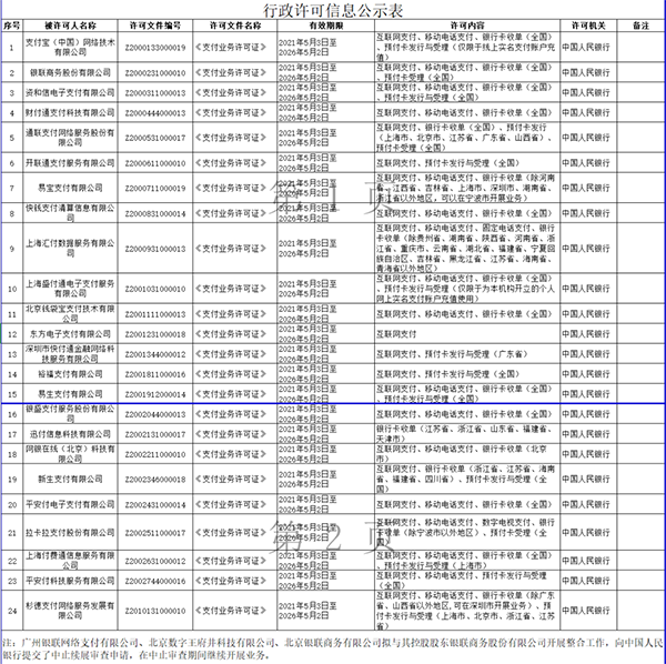 刚刚,央行公布首批27张支付牌照续展结果,财付通、支付宝、拉卡拉、通联支付、银盛支付、汇付天下、付费通、易生支付、快钱支付等24家续展成功。