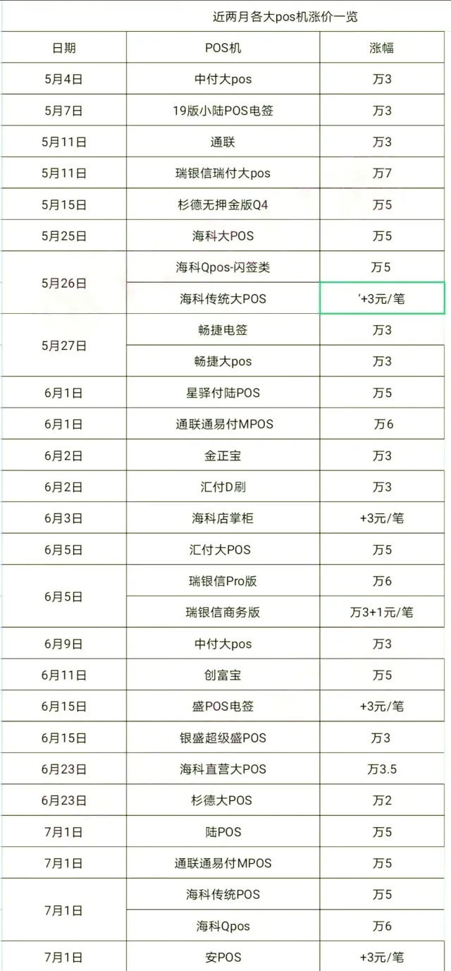 一波未平一波又起,早几天前,通联的pos机代理商结算价才偷偷上涨了万5,之后各POS机的品牌也纷纷加入这涨价大军:海科Qpos涨万6、传统POS涨万5等等。